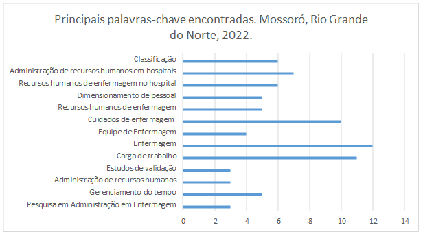 Entre as palavras-chave mais utilizadas destaca-se a predominância do termo “Carga de Trabalho” observada 11 vezes (18,33% das palavras-chave encontradas); seguida de “Enfermagem” que aparece 12 vezes (20%); “Cuidados de Enfermagem” é colocada 10 vezes nos artigos selecionados (16,66%); e “Administração de Recursos Humanos em Hospitais” que aparece 7 vezes e representa 11,66% do total das palavras-chave.