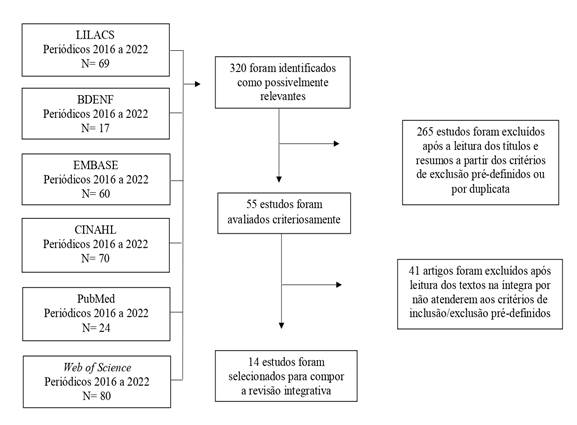 Inicialmente, a busca nas bases de dados evidenciou 320 referências, que foram submetidas à avaliação pelos critérios de inclusão e exclusão. Nessa primeira análise, baseada na leitura dos títulos e resumos, foram selecionados 55 artigos.