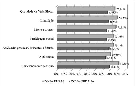 O estudo de Ribeiro, Ferretti e Sá (2017)(6) também atingiu os mesmos resultados do estudo em tela, em que os idosos que residem na zona rural demonstraram melhor percepção geral da qualidade de vida quando comparados aos idosos da zona urbana. Na comparação efetuada, observou-se que os idosos da zona rural apresentaram maiores escores em todas as facetas do WHOQOL-Old (autonomia; atividades passadas, presentes e futuras; participação social; morte e morrer; e intimidade), prevalecendo, portanto, a melhor percepção na avaliação de todos os quesitos que compõem a qualidade de vida.