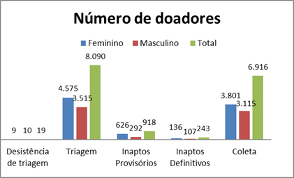 Ainda, faz-se importante ressaltar que entre o processo de cadastro e triagem clínica houve 19 desistências e que de um total de 1.161 doadores considerados inaptos clinicamente para a doação de sangue, 79% foram classificados como inaptos temporários, isto é, pessoas com impedimento por tempo determinado à doação de sangue, enquanto 21% foram considerados inaptos definitivos, pessoas que nunca poderão doar sangue(10).