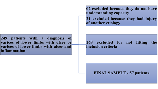 Initially, a first telephone contact was made with patients considered eligible for the research, excluding, at this stage, 169 patients who did not meet the inclusion criteria. There were 80 individuals left, who were invited to participate in the study and when they accepted, a home visit was scheduled according to the participant's availability for the interview. At this stage, 23 patients were excluded, and the sample considered for this study was 57 patients (figure 1).