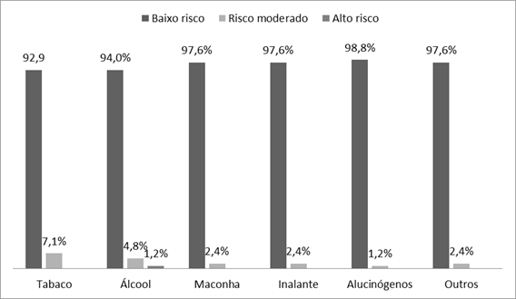 Relativamente aos padrões de consumo, em geral, os participantes apresentaram baixo risco para uma parcela significativa dos exemplares das SPA. Destacam-se como exceções: tabaco (7,1%), álcool (4,8%), maconha (2,4%) e inalantes (2,4%), que apresentaram níveis compatíveis ao consumo de risco moderado, conforme demonstrado no Gráfico 1.