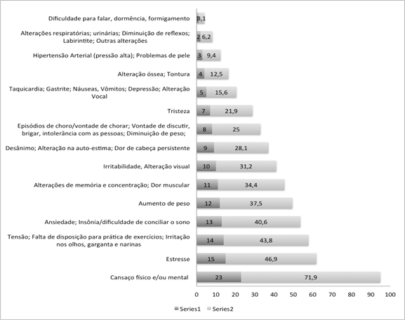 As alterações de saúde referidas pelos docentes universitários; foram: cansaço físico e/ou mental (71,9%), estresse (46,9%), tensão (43,8%), falta de disposição para prática de exercícios (43,8%), irritação nos olhos, garganta e narina (43,8%), ansiedade (40,6%), insônia/dificuldade de conciliar o sono (40,6%), aumento de peso (37,5%), alterações de memória e concentração (34,4%), dor muscular (34,4%), irritabilidade (31,2%), alteração visual (31,2%), desânimo (28,1%), alteração na autoestima (28,1%), dor de cabeça persistente (28,1%), episódios de choro/vontade de chorar (25,0%), vontade de discutir, brigar, intolerância com as pessoas (25,0%), diminuição do peso (25,0%), diminuição da percepção visual (25,0%) dentre outras alterações. Figura 1.
