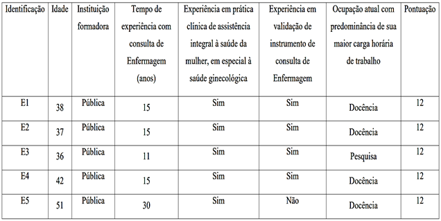 Para a seleção de juízes utilizou-se as recomendações do autor (21), adaptadas para os seguintes critérios e pontuações: I) Ser doutor em Enfermagem (4 pt); Tese na área de interesse (3 pt); Ter publicado artigo na temática abordada pelo estudo (3 pt); Ter experiência na validação de instrumentos/escalas voltados à área de Enfermagem (2 pt); Ter prática clínica recente de, no mínimo, um ano no cuidado à saúde sexual e reprodutiva da mulher (2 pt); Ter experiência em Consulta de Enfermagem (1 pt). Estabeleceu-se como pontuação mínima para inclusão no estudo nove (9) pontos.