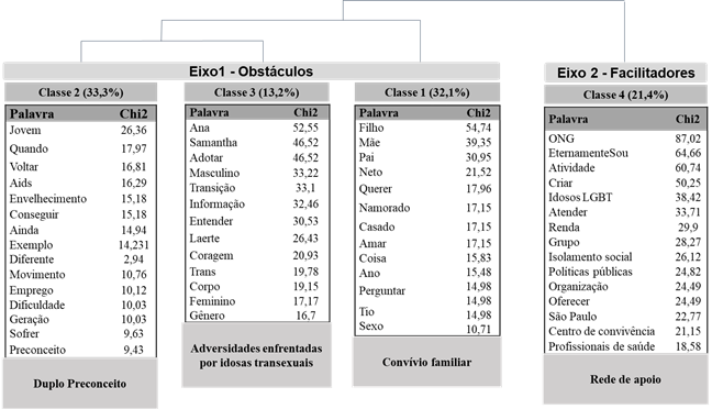 Após o processamento, o corpus foi dividido em dois eixos. O primeiro foi nomeado Obstáculos, formado pelas classes 2 (Duplo preconceito), 3 (Adversidades enfrentadas por idosas transexuais) e 1 (Convívio familiar), totalizando 78,6% do conteúdo de UCE analisadas. O segundo eixo, Facilitadores, é composto pela classe 4 (Rede de apoio), com 21,4% do conteúdo total, conforme apresentado no Dendrograma (quadro 1).