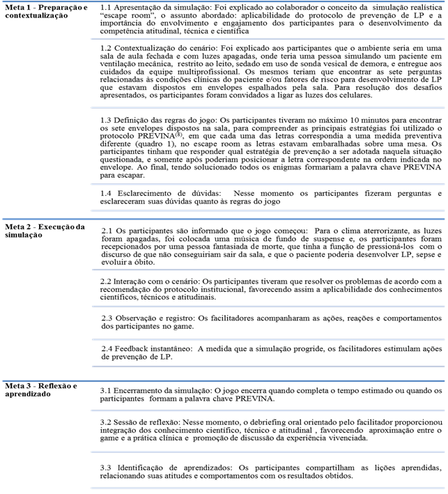 A fim de melhor organizar a condução da atividade, foi seguido um roteiro dividido em três momentos (metas): preparação e contextualização, execução da simulação, reflexão e aprendizado conforme descrito na Tabela 1.