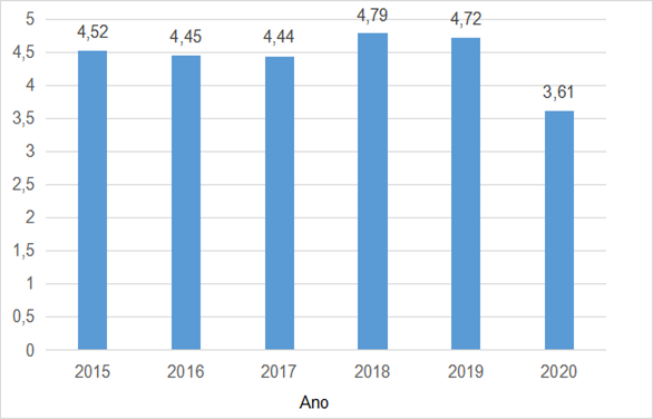 Em relação à taxa de incidência, a maior foi verificada em 2018 (4,79) e a menor em 2020 (3,61). A taxa mantém valores aproximados nos três primeiros anos da série e um discreto aumento no segundo triênio, com uma diminuição mais acentuada no último ano, conforme Figura 1.