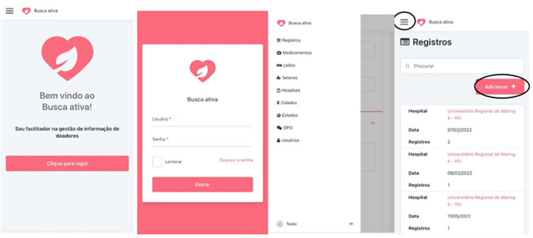 A busca em plataformas de aplicativos, como Google Play® e Apple Store®, foi realizada em maio e junho de 2021, utilizando os termos “Doação de órgãos e tecidos” e “Busca Ativa”, constatando a inexistência de aplicativos específicos para auxiliar profissionais Enfermeiros durante a realização da busca ativa de potenciais doadores de órgãos e tecidos para fins de transplantes.