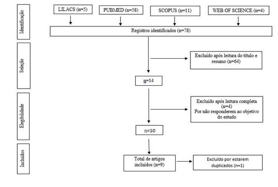 A partir da busca nas bases de dados, foram encontrados 78 artigos, destes, 64 foram excluídos por não atenderem aos critérios previamente estabelecidos. Diante disso, foram selecionados 9 artigos, conforme mostra a figura 1.