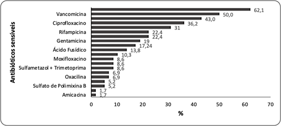 Os antibióticos testados que apresentaram maior sensibilidade nas hemoculturas positivas para Staphylococcus coagulase negativa foram teicoplanina (62,1%), vancomicina (50,0%) e linezolida (43,0%). Os antibióticos com menos sensibilidade foram piperacilina + tazobactama e amicacina (Figura 2).
