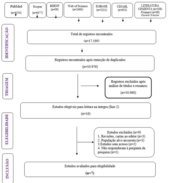 Foram identificados 17.190 estudos, após a retirada das duplicatas, permaneceram 10.976 estudos. Através da leitura de título e resumo, foram selecionados 16 artigos para a segunda fase. Após a leitura na íntegra, foram selecionados sete estudos, de acordo com os critérios de elegibilidade. O fluxograma de seleção dos estudos é apresentado na Figura 1.