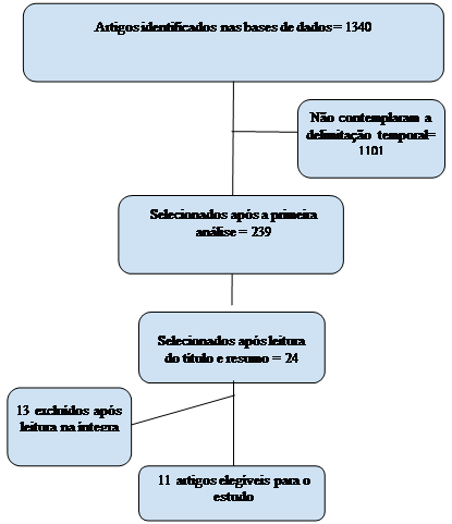 Os critérios de inclusão adotados para seleção das publicações foram: trabalhos que contemplem o objetivo proposto, classificados como originais e publicados nos idiomas português, inglês e espanhol, nos últimos 5 anos, disponíveis completos eletronicamente. Foram excluídos trabalhos incompletos, pagos, duplicados e que não contemplavam o tema abordado no estudo. O resultado da busca encontra-se na figura 1.