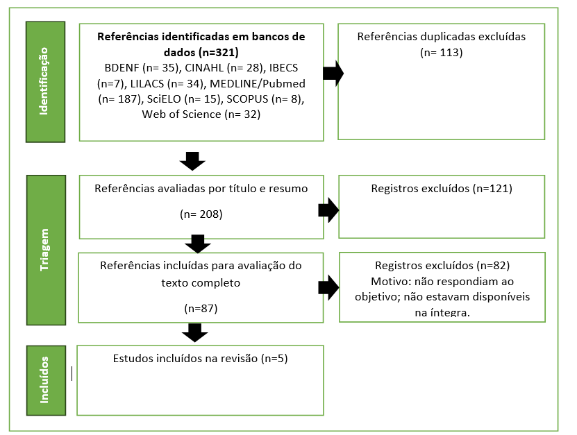 Inicialmente, a busca rendeu 321 estudos. Desse total, 113 duplicatas foram excluídas por meio do envio do material à ferramenta de gerenciamento bibliográfico Mendeley®. A partir daí, foram aplicados os critérios de inclusão e exclusão por meio da leitura atenta dos títulos e resumos dos 208 artigos restantes. Após essa abordagem, cinco estudos foram selecionados. Os artigos completos foram analisados por dois pesquisadores, de forma independente, e após consenso entre eles, esses cinco artigos atenderam ao objetivo da pesquisa e foram incluídos como resultado final.