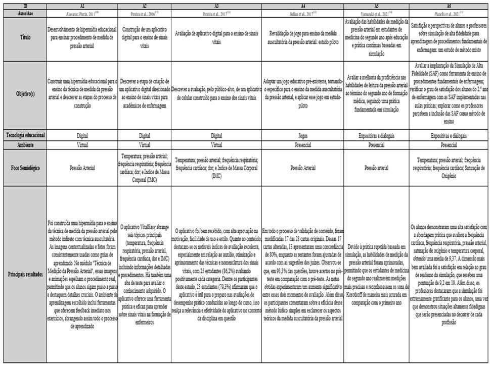 Os artigos avaliados nessa revisão integrativa, A1 a A6, contemplam o estudo dos sinais vitais, diferenciando-se apenas no foco semiológico enfatizado, que vai desde a elaboração de uma hipermídia educacional com foco no ensino da técnica de aferição da pressão arterial (A1), desde a construção e avaliação de um aplicativo digital para ensino de sinais vitais, abrangendo tópicos como temperatura, frequência respiratória, frequência cardíaca, pressão arterial, dor e Índice de Massa Corporal (A2 e A3).