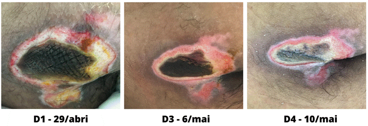 No terceiro dia de avaliação, 6 de maio, observou-se contração das bordas, com diminuição da extensão e maior definição de área de necrose central, porém em menor extensão. Foi realizado novamente o desbridamento instrumental, do tipo square, sendo seguidos os procedimentos de limpeza da LP e de aplicação de FBM, mantendo aplicação de papaína 2 e 10% como coberturas primárias. No total, foram realizadas quatro aplicações de FBM.