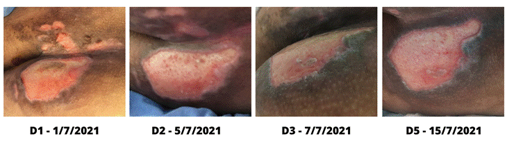 No segundo dia de tratamento, 1 de julho, a área perilesional encontrava-se mais íntegra, friável e hiperemiada. As bordas aproximaram-se do centro e o leito contava com menor quantidade de necrose seca (D2 da Figura 3). Foram seguidos os protocolos de limpeza da LP e tratamento com FBM. Nas bordas e na região de hiperemia, devido a dermatite por uso de fralda, optou-se pelo uso de creme barreira como agente protetor do tecido e no leito da ferida, como agente desbridante, foi aplicado o gel de papaína 10%. A equipe de enfermagem e pesquisadores realizaram orientação com familiares sobre a importância de realizar o reposicionamento no leito com maior frequência ao decorrer do dia, uma vez que o paciente apresentava dificuldade para fazer a descompressão da área.