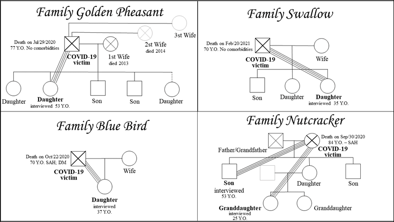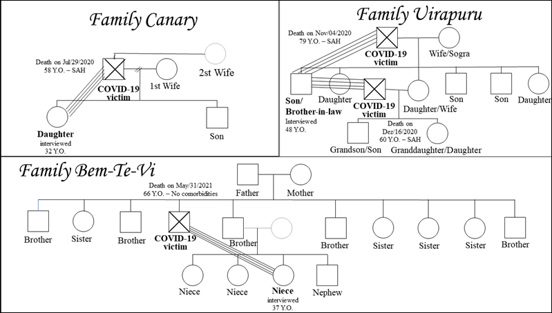 The participants, 12 family members of fatal victims of COVID-19, are presented in Figure 01, Figure 02 and Figure 03 (family genogram, whose caption is in Figure 04). This instrument was adapted to contextualize the interviewee in relation to the victimized relative, with emphasis on the degree of kinship between them, age of both, date of death and presence of comorbidities of the victim (Systemic Arterial Hypertension (SAH) and Diabetes Mellitus (DM), among others) and projection of the type of bond they had with each other, based on Mitchell's Psychofigure (8).