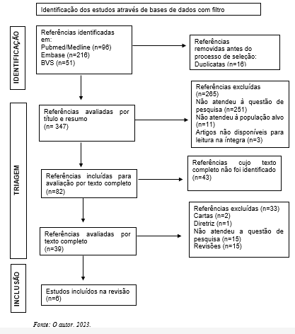 Para construção deste trabalho, incluíram-se os artigos disponíveis na íntegra gratuitamente, nos idiomas português, inglês e espanhol, seguindo recorte temporal dos últimos 10 anos (2013-2023), considerando que, na última década, houve evolução dos tratamentos oncológicos e avanço para o olhar da sobrevida nessa população, tendo como ponto de partida a publicação da Primeira Diretriz Brasileira de Cardio-oncologia de 2011(9), que direciona ações para o cuidado cardiovascular seguro; e estudos realizados em humanos que abordavam as repercussões cardiovasculares nos sobreviventes de câncer infantojuvenil. Excluíram-se artigos cujo título ou resumo não corresponderam ao objeto, àquestão do estudo e aos objetivos da pesquisa; artigos de revisão, cartas, diretrizes, teses, dissertações ou livros.
