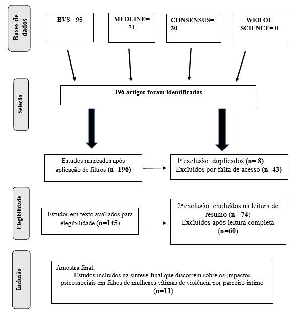 A revisão foi realizada seguindo um caminho metodológico: identificação do problema de pesquisa; pesquisa na literatura, organização dos achados qualitativos; análise e interpretação dos dados e apresentação da discussão gerada. A elaboração da pergunta de pesquisa seguirá o acrônimo PICo (P-população; I- fenômeno de interesse e Co-contexto). Dessa forma, a pesquisa será norteada pela seguinte pergunta: Quais os impactos psicossociais para os filhos de mulheres vítimas de violência por parceiro íntimo (VPI)?