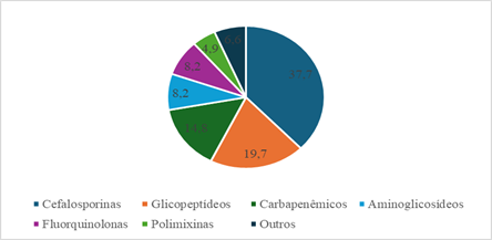 Quanto a antibioticoterapia prescrita aos pacientes, observou-se predomínio da classe das cefalosporinas (37,7%), seguido dos glicopeptídeos (19,7%) e carbapenêmicos (14,8%), conforme demonstrado na figura 1.