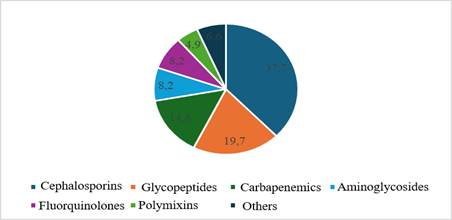 Regarding antibiotic therapy prescribed to patients, there was a predominance of the cephalosporin class (37.7%), followed by glycopeptides (19.7%) and carbapenems (14.8%), as shown in figure 1.