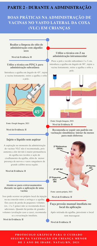 A estruturação do protocolo seguiu a sequência definida por estas autoras, assim os achados foram dispostos em três seções distintas: antes da administração da vacina, durante e após. Cada etapa das boas práticas descritas no protocolo foi enriquecida com uma imagem correspondente, proporcionando uma abordagem visual que facilitasse a assimilação das informações e a compreensão da mensagem transmitida.