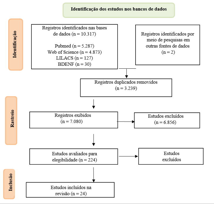 Apresenta-se no fluxograma abaixo, o levantamento bibliográfico realizado para busca e seleção dos artigos. O cruzamento dos descritores permitiu a identificação de 10.317 estudos, além de 2 outras fontes externas, e após a exclusão dos artigos duplicados, por meio do software Zotero versão 5.0, restaram 7.080 produções; procedeu-se à leitura de títulos e resumos, dos quais 224 estudos foram selecionados para leitura completa; excluiu-se aqueles que não contemplaram o objetivo desta revisão. Ao final, selecionou-se 22 artigos e 2 fontes externas.