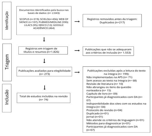 Mediante a análise dos 2.043 estudos identificados, apenas 74 artigos responderam à questão de pesquisa e compuseram a amostra final. No fluxograma (Figura 1) foi apresentada a seleção dos estudos.