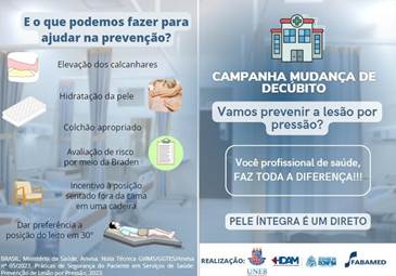 Com os estudos das viabilidades realizadas, os autores adotaram uma abordagem multifacetada para institucionalizar a mudança de decúbito de 2 em 2 horas, como preconizado pela Anvisa, 2023(11). Com a intenção de melhorar a adesão à fase educativa, os discentes realizaram dois momentos com toda a equipe in loco, no horário de trabalho, no formato de roda de conversa.