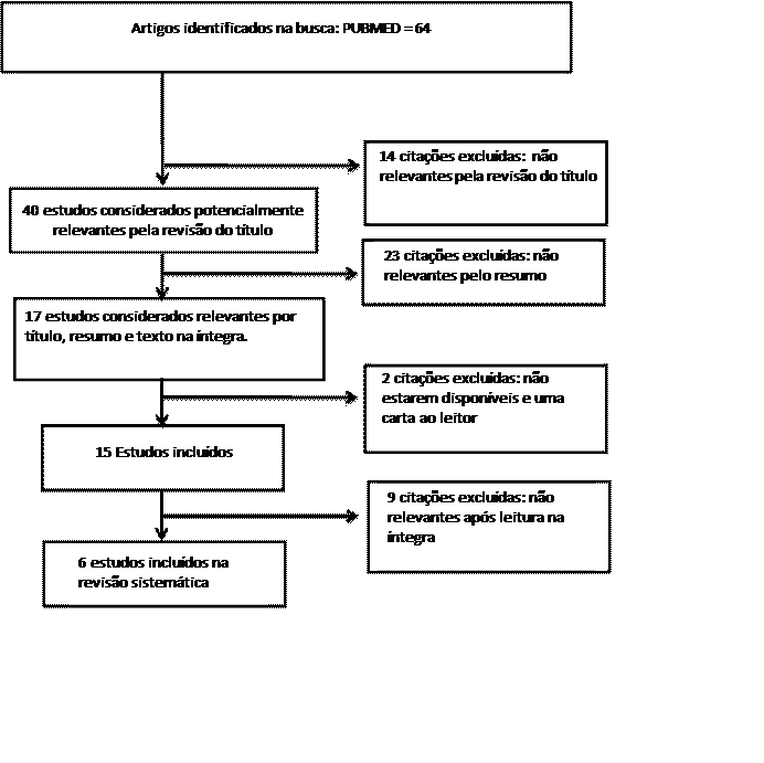 O processo seguido para a seleção dos artigos é mostrado na Figura 1. Foram identificados 64 artigos na base de dados da PubMed. Após a leitura dos títulos, foram excluídos 14 que não atendiam aos critérios de inclusão, 40 foram selecionados para leitura do resumo, sendo excluídos 23, seguindo 17 para leitura do texto na íntegra.