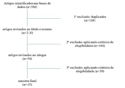 A pesquisa nas bases de dados resultou em 386 artigos, sendo 287 na MEDLINE, 51 na BDENF, 44 na LILACS e 4 na IBECS. O Fluxograma 1 apresenta as etapas do processo de seleção das publicações.