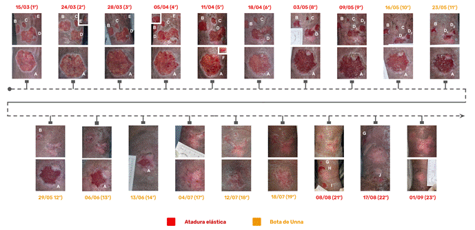 No 10º dia de atendimento, foram percebidas falhas na técnica de passagem da atadura elástica, optando-se pela troca para bota de unna. Nas duas semanas seguintes, o paciente afirmou piora do quadro álgico devido à compressão. Todas as lesões (A, B, C, D1, D2) apresentaram redução de área de, respectivamente, 1,93 cm², 1,09 cm², 0,06 cm², 0,78 cm² e 2,34 cm².