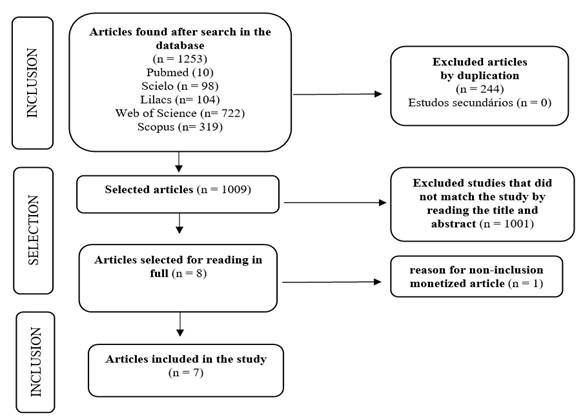 Pubmed=10; Scielo=98; Scopus=319; Web of Science=722). Of this total, 244 duplicates were excluded. After reading the title and abstract, eight articles remained, which were selected for full reading. After reading, one article was excluded because it was monetized. The final sample consisted of seven articles, which were included in this review (Figure 1).