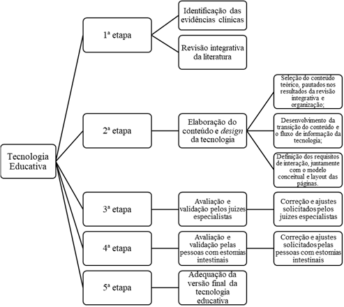 A presente investigação realizou-se em 5 etapas de elaboração e validação da tecnologia educativa, a saber: 1) Construção da tecnologia educativa a partir da identificação das evidências clínicas e construção da Revisão integrativa da literatura; 2) Elaboração do conteúdo e design da tecnologia educativa; 3) Avaliação e validação do conteúdo e design por um painel de juízes especialistas com enfoque nos objetivos, organização e relevância da tecnologia educativa; bem como validação quanto sua organização, estilo da escrita, aparência e motivação; 4) Avaliação e validação do conteúdo e design pelas pessoas com estomias intestinais, bem como validação quanto sua organização, estilo da escrita, aparência e motivação da tecnologia educativa; 5) Adequação da versão final da tecnologia educativa(18).
