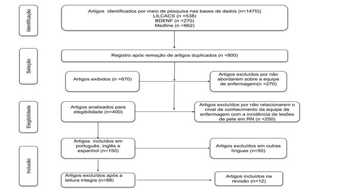 A busca foi realizada em 2024, nas seguintes bases de dados: Medical Literature Analysis and Retrieval System Online (MEDLINE), Banco de Dados em Enfermagem (BDENF), através da biblioteca virtual em saúde (BVS) e Literatura Latino-Americana e do Caribe em Ciências da Saúde (LILACS). Não foi estabelecido recorte temporal para inclusão dos textos. Os termos utilizados nas pesquisas, extraídos do Descritores em Ciências da Saúde (DeCS) e do Medical Subject Headings (MeSH), foram: Ferimentos e Lesões, Recém-Nascido, Enfermagem neonatal e Equipe de Enfermagem, bem como suas respectivas versões em Português, Inglês e Espanhol. A seleção dos artigos foi feita de forma independente, sendo que os critérios de inclusão foram: estudos originais publicados na íntegra que abordassem, no título ou resumo, relação do nível de conhecimento da equipe de enfermagem com a prevenção de lesões de pele em recém-nascidos, estudos publicados nos idiomas português, inglês e espanhol, foram selecionados no total 12 artigos, sendo 12 artigos. Foram excluídos trabalhos como: relatos de caso ou experiência, cartas, editoriais e publicações em que o método não foi claramente descrito.