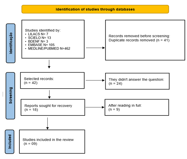 The search formula used consisted of the following Health Descriptors (HMDs) and a Boolean operator: Technologies and self-care and Type 1 Diabetes Mellitus. The texts were complete and in Portuguese, English, and Spanish. Initially, 590 articles were found, but 41 were removed before screening for duplicates. After applying filters that identified those that did not answer the question and reading them in full, nine articles remained for inclusion in the review.