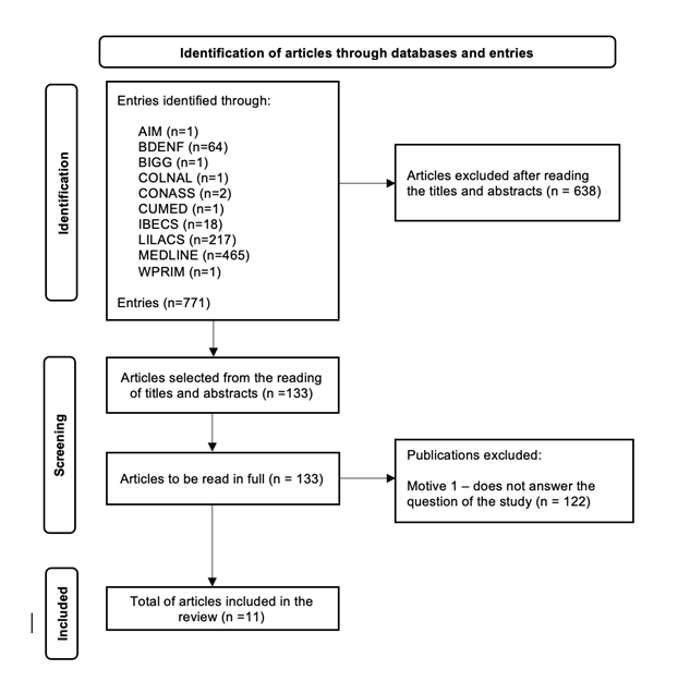 The study selection process was systematized using the PRISMA 2020 Flowchart (Preferred Reporting Items for Systematic Reviews and Meta-Analyses)7. The initial search resulted in 771 articles distributed in the MEDLINE (465), LILACS (217), BDENF (64), IBECS (18) and other VHL databases (7). After screening by title and abstract, 133 studies were selected for full analysis. Out of these, 122 were excluded because they did not meet the eligibility criteria, resulting in a final sample of 11 articles for the creation of the matrix, as shown in Figure 1.