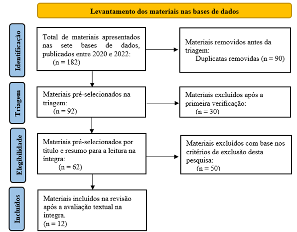 A amostra desta revisão de escopo resultou em 12 artigos científicos, sendo cinco publicados em 2020, um em 2021 e, seis, em 2022. Todo o processo de seleção dos materiais, baseado no PRISMA-ScR(15), consta na Figura 1. Não foram identificadas produções da literatura cinzenta elegíveis para esta pesquisa.