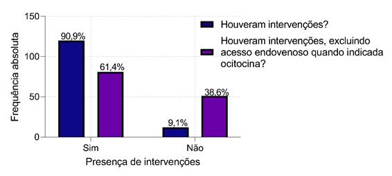 O estudo contou com 132 participantes incluídas, com a maioria tendo a presença de intervenções em seu parto (90,9% n=120). Quando se excluíram os casos de pacientes que portavam acesso venoso para indução/condução com ocitocina, as intervenções se mantiveram ocorrendo (61,4% n=81), conforme demonstrado na Figura 1.