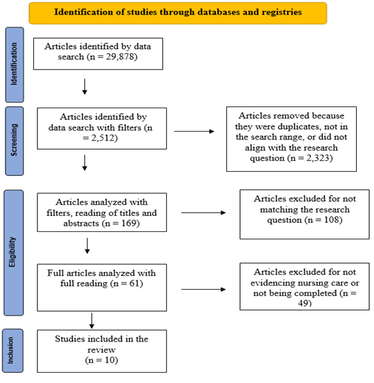 The selection of articles occurred in four stages. Initially, the combined descriptors generated a total of 29,878 articles in the databases. In the second stage, filters were applied for full-text availability, languages, and publication date, reducing the number to 2,512 articles, which were organized sequentially in a text document. After eliminating duplicates and analyzing the titles and descriptors, 169 articles went on to the third stage, where a reviewer evaluated abstracts, introductions, and conclusions to determine relevance. In the fourth stage, 61 articles were read in full; 12 studies were included because they fully met the research question; however, two studies were excluded because they were secondary reviews, thus the final inclusion result was 10 studies.