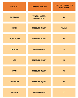 Figure 2 - Arrangement of types of chronic wounds in studies considering country and level of evidence in a search carried out in 2023.