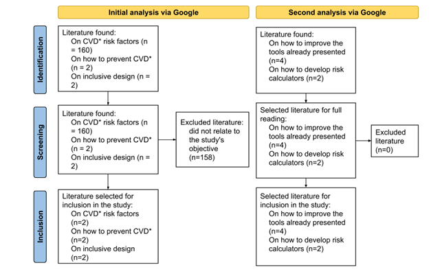 It is important to highlight that, once the research objective is defined, it becomes essential that researchers establish a guiding question to guide the bibliographic investigation (16). In this sense, the first search was structured from three main questions due to the distinct approaches that make joint analysis impossible through a single central question. Thus, each question corresponds to a specific axis, allowing for a more consistent and contextualized investigation: (1) "What are the main factors that contribute to the development of cardiovascular diseases in the elderly?" (2) "What strategies are most effective in preventing these factors?" and (3) "What is the most appropriate design for applications aimed at the elderly?". Below is the research flowchart.