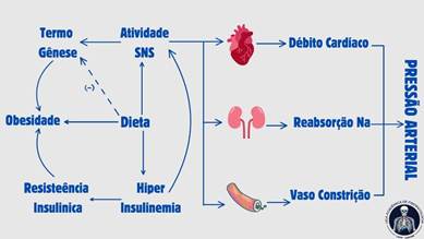 A sensibilidade ao sódio também desempenha um papel importante na patogênese da hipertensão. Indivíduos sensíveis ao sódio apresentam elevações mais acentuadas da pressão arterial em resposta à ingestão de sódio, uma condição mais comum em populações idosas, hipertensos com renina baixa, diabéticos e pacientes com insuficiência renal. Defeitos na excreção renal de sódio contribuem para a retenção de líquidos e a elevação da pressão arterial. Em concomitância, a obesidade, especialmente a obesidade central, é outro fator de risco significativo para a hipertensão. Ela está associada à síndrome metabólica, que inclui resistência à insulina, dislipidemia e hipertensão sensível ao sódio. A relação entre obesidade e hipertensão é mediada por alterações hemodinâmicas e hormonais, incluindo a ativação do SNS e do sistema renina-angiotensina(4).