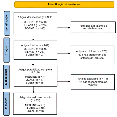 The initial search in the databases resulted in 932 articles, distributed as follows: 560 linked to MEDLINE, 269 to LILACS, and 103 to BDENF. After applying filters for time frame and language, the number was reduced to 709 articles, which were exported to the Rayyan platform for selection. In the analysis of titles and abstracts, 673 articles were excluded for not meeting the inclusion criteria, leaving 36 articles for full-text reading. After this reading, 14 articles were excluded for not answering the research question. Thus, the final corpus consisted of 22 articles. The selection process is detailed in Figure 1.