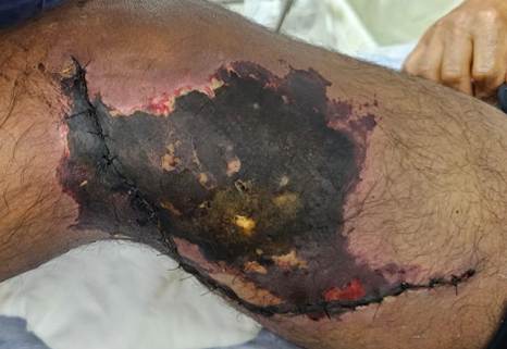 Exame físico do membro inferior direito: membro com edema significativo quando comparado ao membro contralateral, endurecido, pulsos pedioso e tibial posterior palpáveis. Pele desidratada e com higiene precária. Observado hematomas extensos e isquemia no local da sutura e nas áreas adjacentes. No terço médio da ferida, havia drenagem de exsudato seroso espontaneamente, com discreto afastamento de bordas ao longo da sutura. Extensão aproximada de 25 cm x 18 cm em suas maiores dimensões (Figura 1).