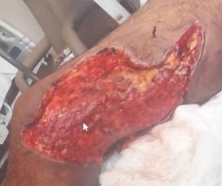 No D3, o usuário já se encontrava sem dor, com regressão do edema e diminuição dos sinais de inflamação do membro. No entanto, a lesão cutânea evoluiu com deiscência e necrose extensa e no D9 houve necessidade de encaminhamento para serviço hospitalar para desbridamento cirúrgico.
