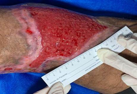 A lesão apresentava extensão aproximada de 30 cm x 20 cm em suas maiores dimensões e 2,5 cm de profundidade, tecido do leito da ferida 90% de granulação insalubre e 10% de esfacelo aderido, sem sinais de infecção sistêmica, grande quantidade de exsudato serosanguinolento, sem odor fétido, bordas aderidas e regulares. (Figura 2).
