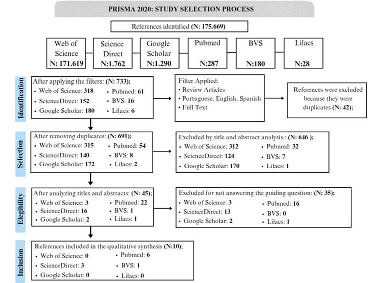 The PRISMA 2020 statement emphasizes that systematic reviews should describe in a transparent and detailed manner the process of identifying and selecting studies. It also highlights that the guidelines also recommend the use of a flowchart that presents the steps of identification, screening, eligibility and final inclusion of studies. Considering these guidelines, the following flowchart was developed, which brings together all the steps of the study selection process for this review(11).